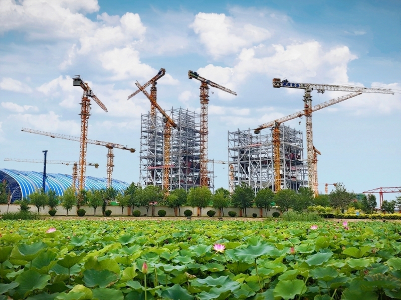 在荷塘的彼岸,塔吊高耸,焊花飞溅,钢筋水泥在烈日下凝固成新的骨骼。建设者身着工装,在钢架上攀爬、焊接、浇筑。他们的脸庞被晒得通红,汗水在安全帽边缘汇成细流,滴落在滚烫的钢板上,瞬间化作白烟。可他们的脚步不曾停歇,手中的工具依旧精准有力。锅炉房的轮廓在热浪中日渐清晰,像一座正在苏醒的钢铁巨兽,一寸寸拔地而起。
