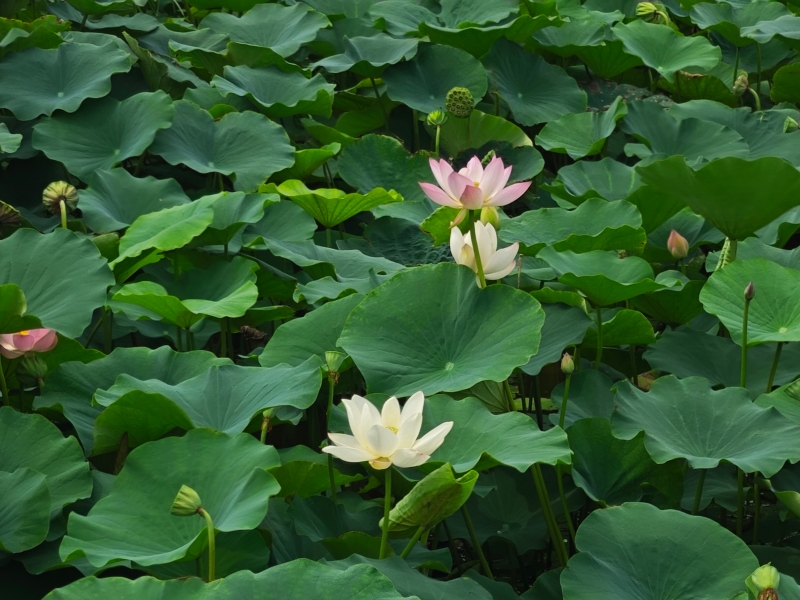 在施工现场边缘,一片荷花池倔强地铺展着生命的绿意。荷叶如盖,层层叠叠,在滚烫的空气中撑起一片片清凉的绿荫。粉白的荷花,从淤泥中挺立而出,不惧烈日炙烤,不避尘土纷扰,在蒸腾的暑气里,将花瓣一片片、一瓣瓣,倔强地舒展到极致。露珠在叶心滚动,像不肯融化的泪,映照着蓝天与钢架的倒影。它们不争不抢,却以静默的绽放,宣告着生命对酷热的蔑视。
